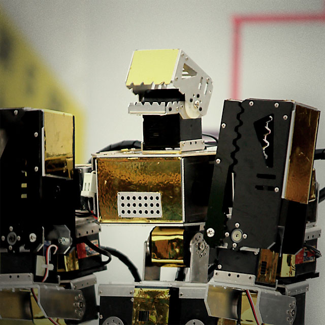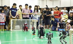 二足歩行ロボットによる3vs3のサッカーパフォーマンスも行っています。